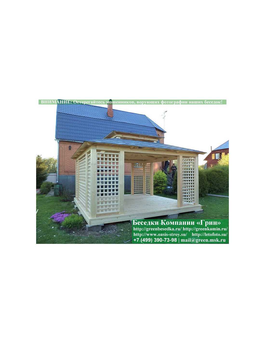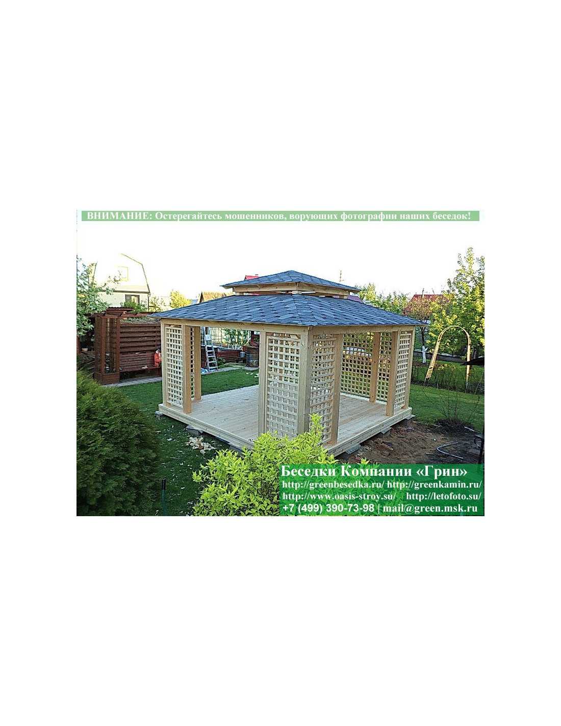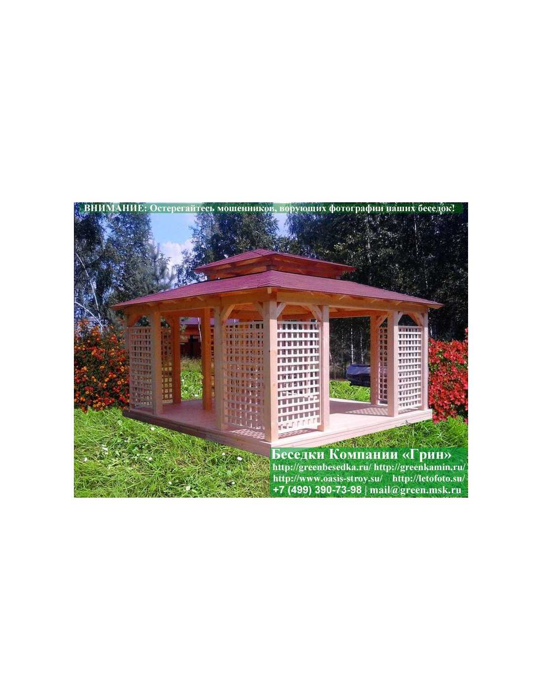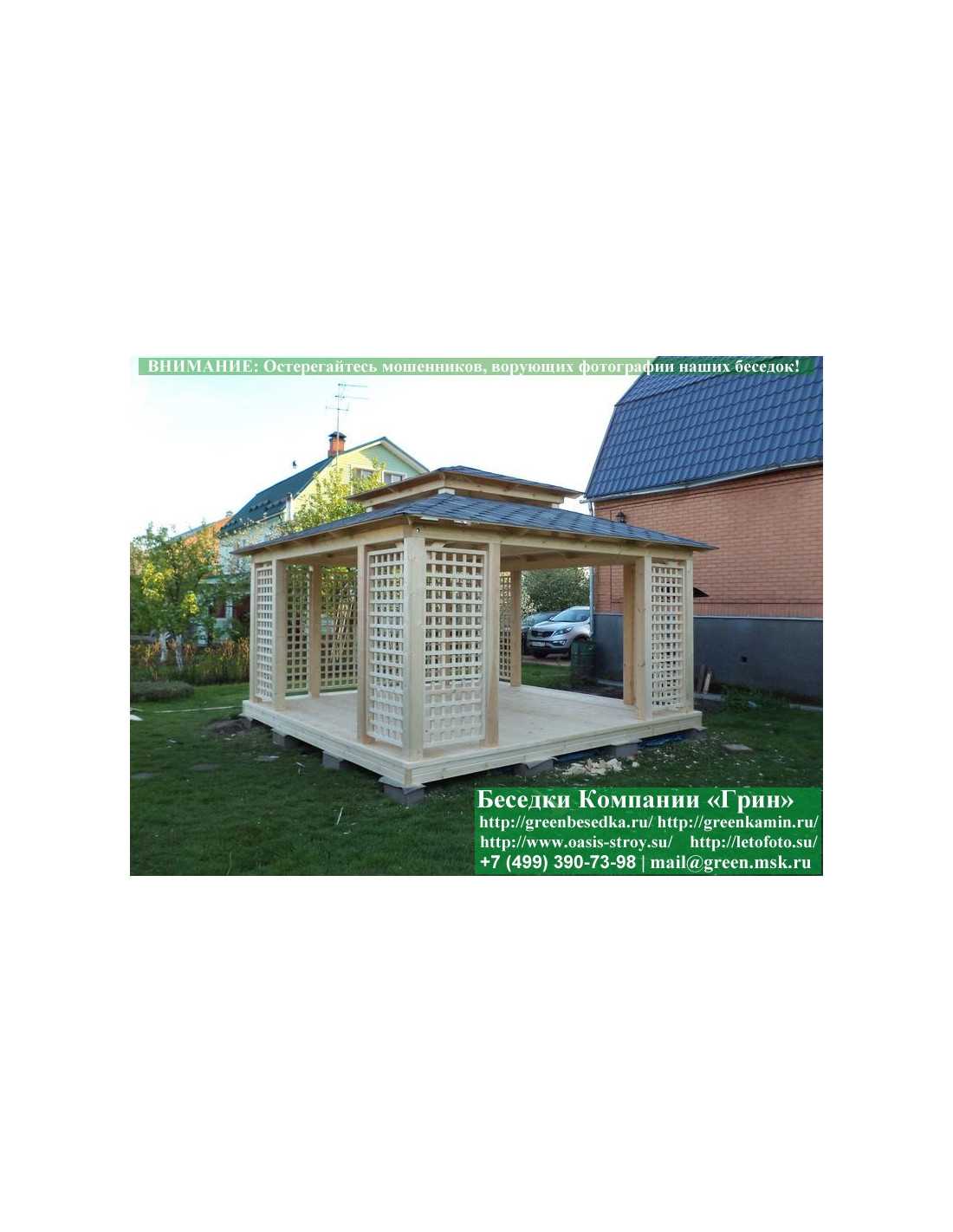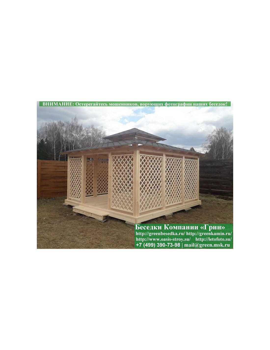 Беседка "Шатер для дачи 4,5х4,5" изготавливается из сосны, с двухъярусной крышей с воздушным клапаном. Крышу можно заменить на сплошную одноярусную. При строительстве беседок используется сухой материал камерной сушки. В качестве несущих стоек используется строганый брус 90х90 или 140х140 мм. На крышу беседки укладывается мягкая битумная черепица: Коричневых, Зеленых, Бордовых, Серых цветов. Стандартно изготавливается беседка открытая с 4-х сторон, но любую сторону можно закрыть перголой (решеткой) до потолка. Срок изготовления и монтажа беседки на участке составляет 7-10 дней. Беседки поставляются в не крашеном виде. Возможна покраска беседок или обработка антисептиком.