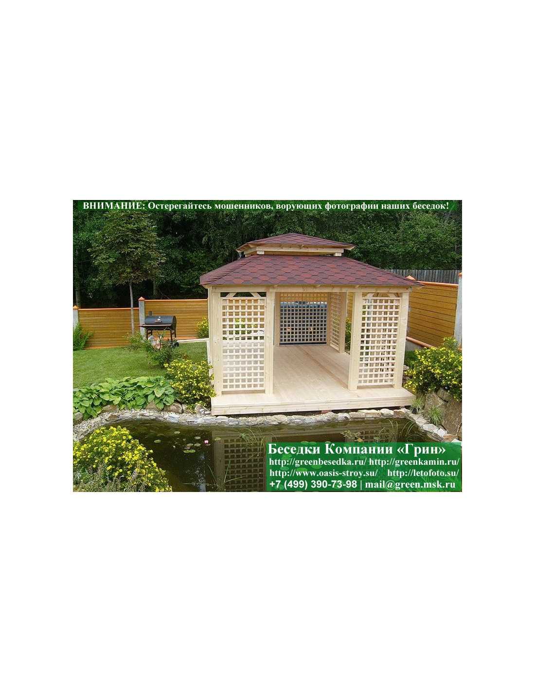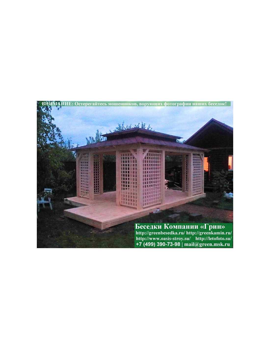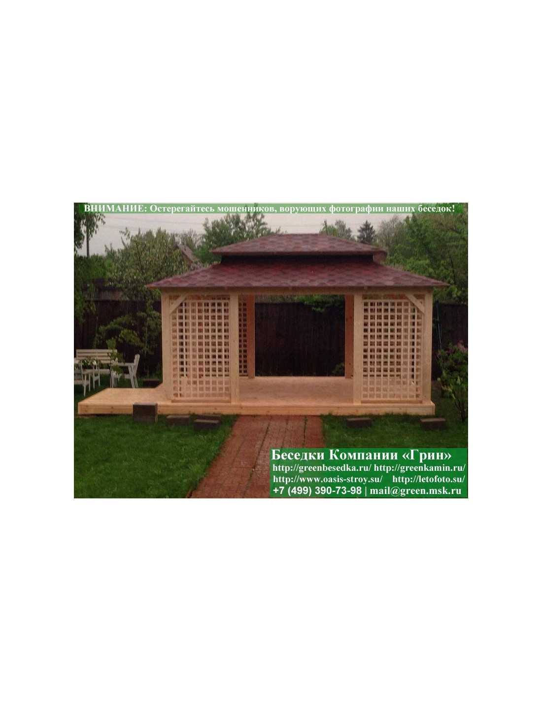 Садовая беседка "Шатер для дачи 4х6" изготавливается из сосны, с двухъярусной крышей с воздушным клапаном. В данном варианте беседка состоит из 2-х частей, самой беседки 4х5 метров и патио 1х4 метра. Патио возможно удлинить по размерам. Крышу можно заменить на сплошную одноярусную. При строительстве беседок используется сухой материал камерной сушки. В качестве несущих стоек используется строганый брус 90х90 или 140х140 мм. На крышу беседки укладывается мягкая битумная черепица: Коричневых, Зеленых, Бордовых, Серых цветов. Стандартно изготавливается беседка с 4-мя входами. Возможно изменение количества входов. Срок изготовления и монтажа беседки на участке составляет 7-10 дней. Беседки поставляются в не крашеном виде. Возможна покраска беседок или обработка антисептиком.