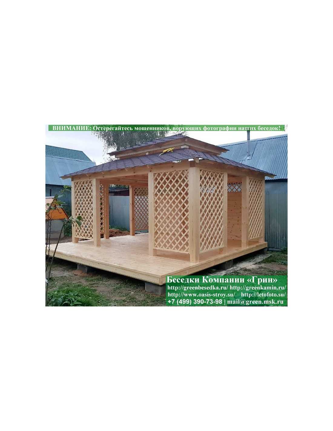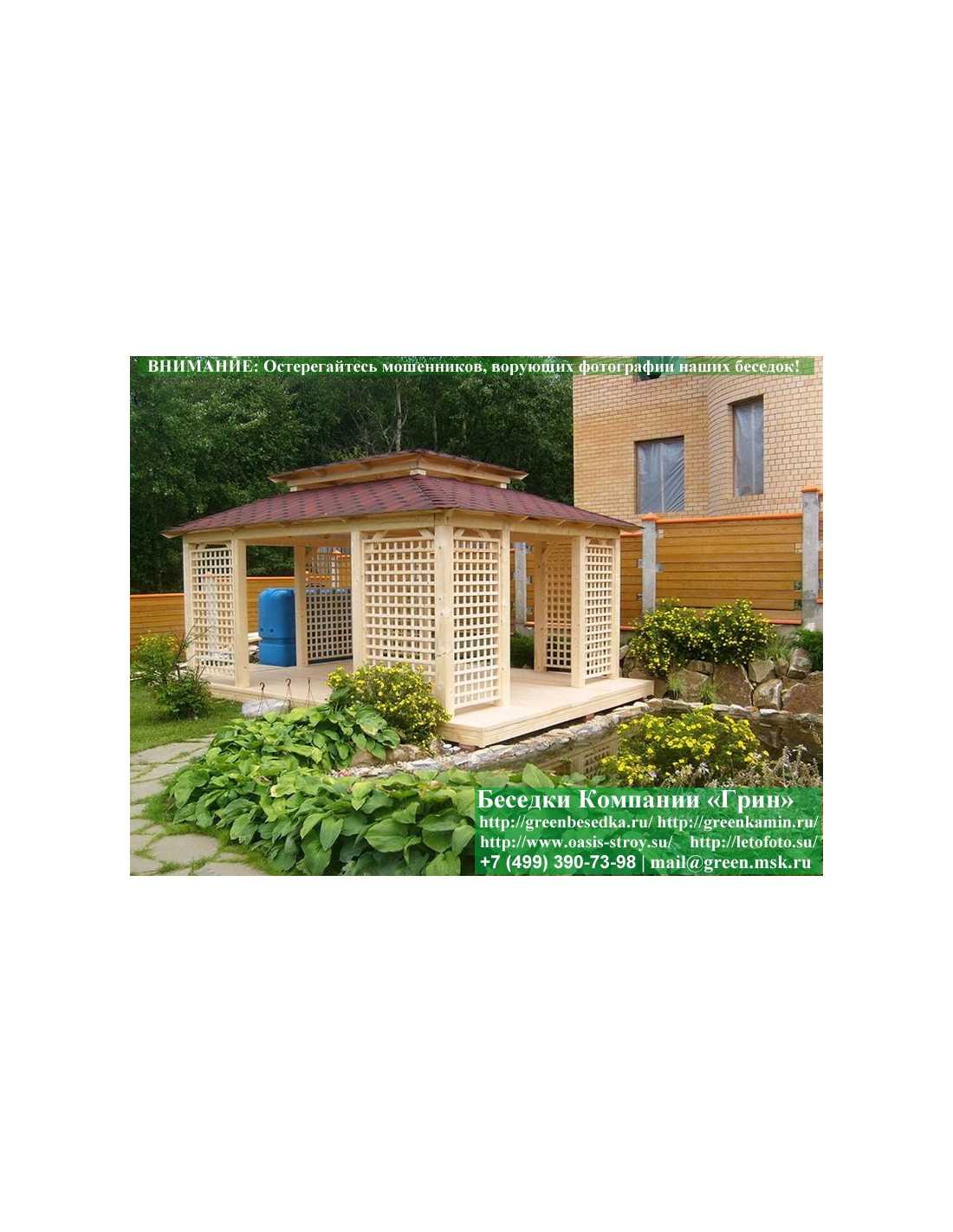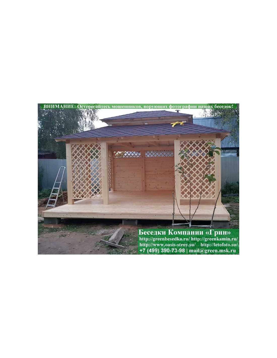Садовая беседка "Шатер для дачи 4х6" изготавливается из сосны, с двухъярусной крышей с воздушным клапаном. В данном варианте беседка состоит из 2-х частей, самой беседки 4х5 метров и патио 1х4 метра. Патио возможно удлинить по размерам. Крышу можно заменить на сплошную одноярусную. При строительстве беседок используется сухой материал камерной сушки. В качестве несущих стоек используется строганый брус 90х90 или 140х140 мм. На крышу беседки укладывается мягкая битумная черепица: Коричневых, Зеленых, Бордовых, Серых цветов. Стандартно изготавливается беседка с 4-мя входами. Возможно изменение количества входов. Срок изготовления и монтажа беседки на участке составляет 7-10 дней. Беседки поставляются в не крашеном виде. Возможна покраска беседок или обработка антисептиком.