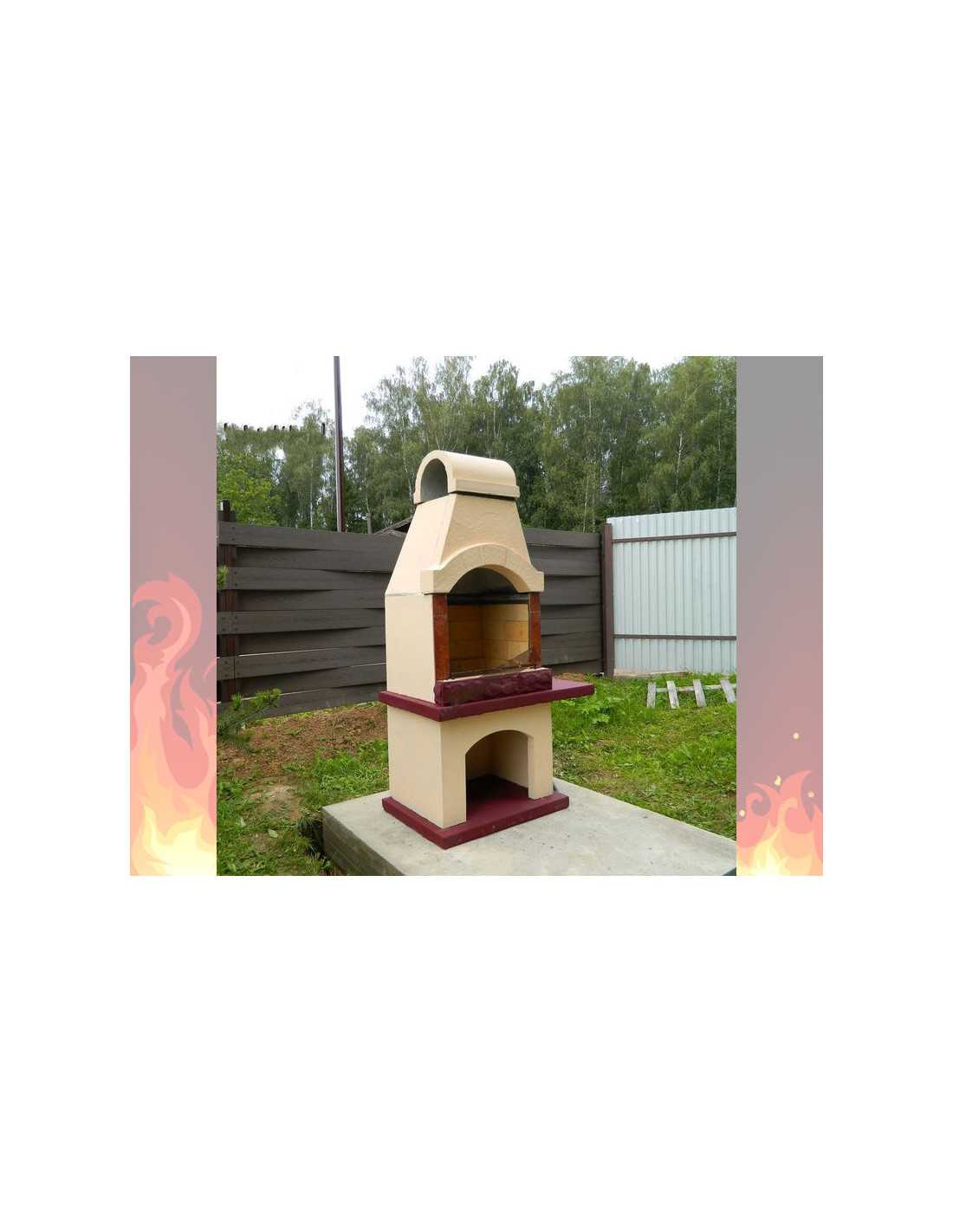 Печь барбекю облицована огнеупорным гибким кирпичом, столешница и нижняя подушка облицованы керамической плиткой.Выполнена из огнеупорного кирпича и армированного бетона. Снизу предусмотрено место для дров.Топливо: уголь и дрова.