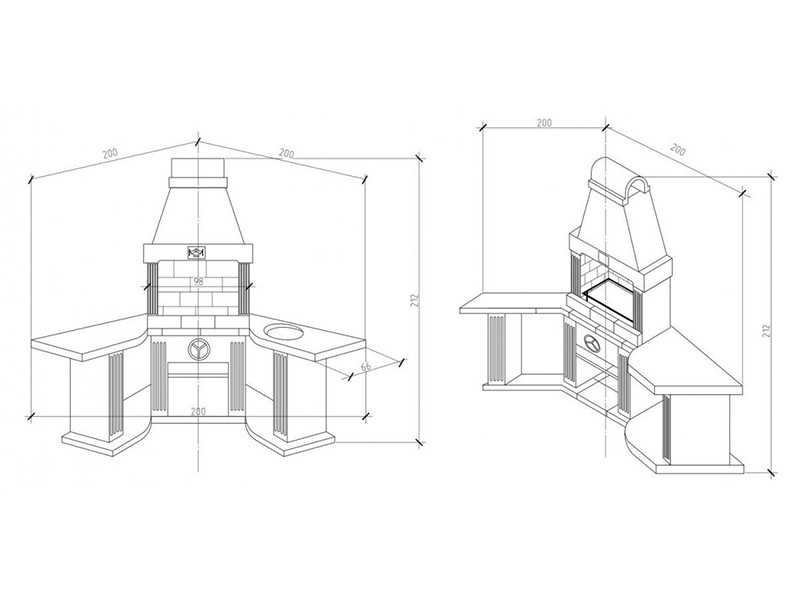 Конструкция комплекса-барбекю № 18 разработана специально для установки в углу беседки, летней кухни, между двумя частями забора. За счет того, что топка как бы уходит вглубь, а столешницы вынесены вперед, получается очень удобное, полузакрытое пространство для приготовления еды.