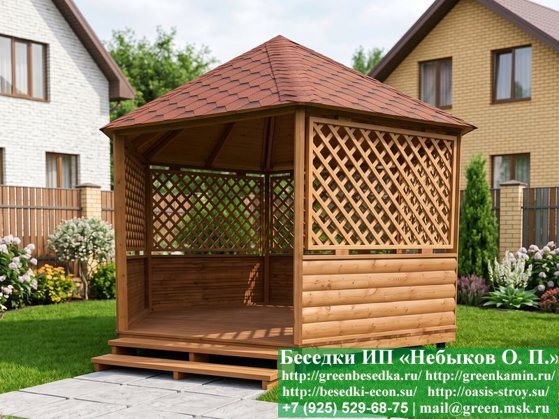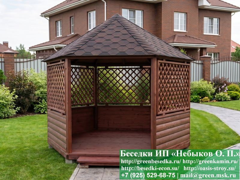 Схема размеров шестигранной беседки 3х3.Круглая закрытая застекленная беседка диаметром 4 метра изготавливается из сосны. При строительстве беседок используется сухой материал камерной сушки. В качестве несущих стоек используется строганый брус 90х90 мм. Ниже подоконника беседка закрывается блокхаусом (имитация бревна). Выше подоконника устанавливаются перголы (решетки) с косыми ячейками. Перголы-шпалеры закупаются у мастера, который занимается их изготовлением 15 лет. Сухой материал тщательно полируется. На пол кладется толстая сухая строганая доска 35 мм. На крышу укладывается мягкая гибкая черепица "Технониколь": Коричневых, Зеленых, Бордовых, Серых цветов. Срок изготовления и монтажа беседки на участке составляет 7-10 дней. Беседки поставляются в не крашеном виде. Возможна покраска беседок или полная обработка антисептиком.