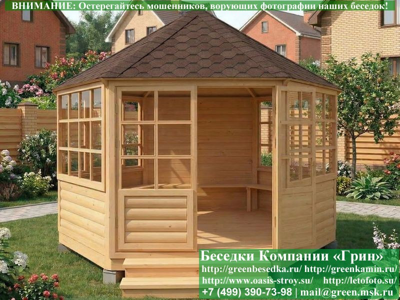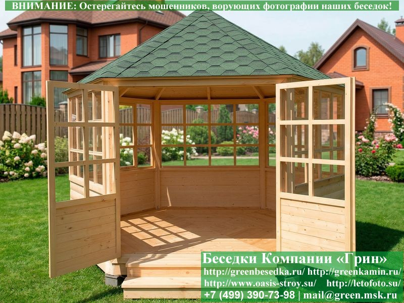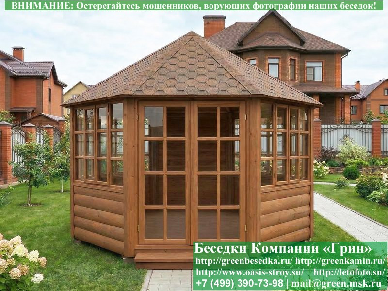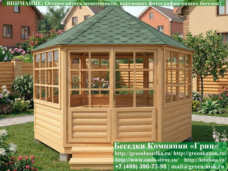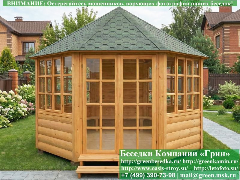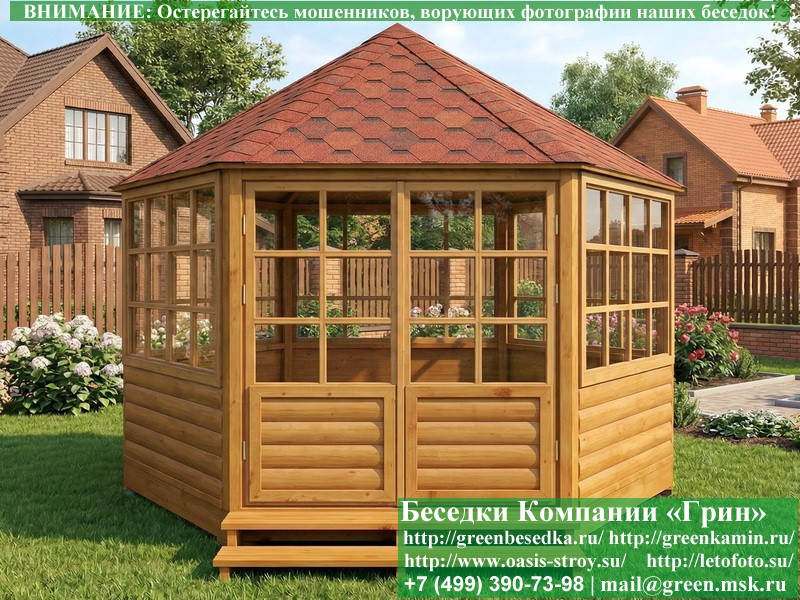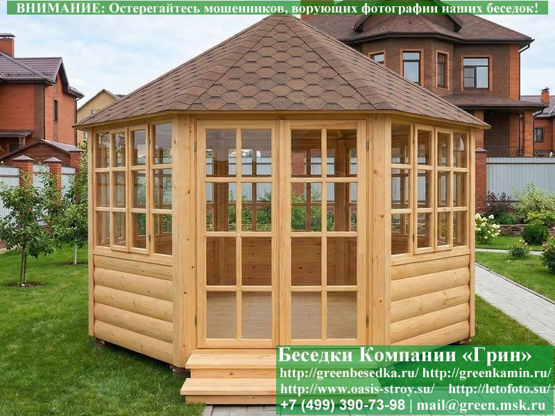 Красивая закрытая застекленная круглая деревянная шестиугольная беседка для дачи, загородного дома диаметром 4 метра. Фото и цены. В интернет-магазине 'Беседки-Экон' вы можете купить интересную застекленную круглую шестигранную беседку из дерева диаметром 4 метра для сада, отдыха под ключ с монтажом в Брянске и Брянской области. Изготовление и строительство прочных закрытых деревянных 6-ти гранных, 6-ти угольных беседок возможно так же в Москве, Московской, Тверской, Тульской, Калужской, Ярославской, Владимирской, Рязанской, Ивановской, Орловской, Костромской, Новгородской, Смоленской, Воронежской, Тамбовской, Нижегородской, Псковской, Курской, Липецкой, Ленинградской и некоторых других областях.