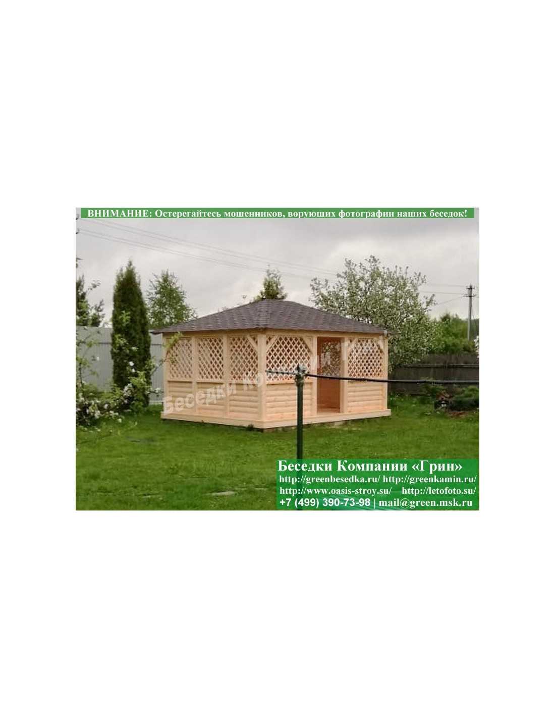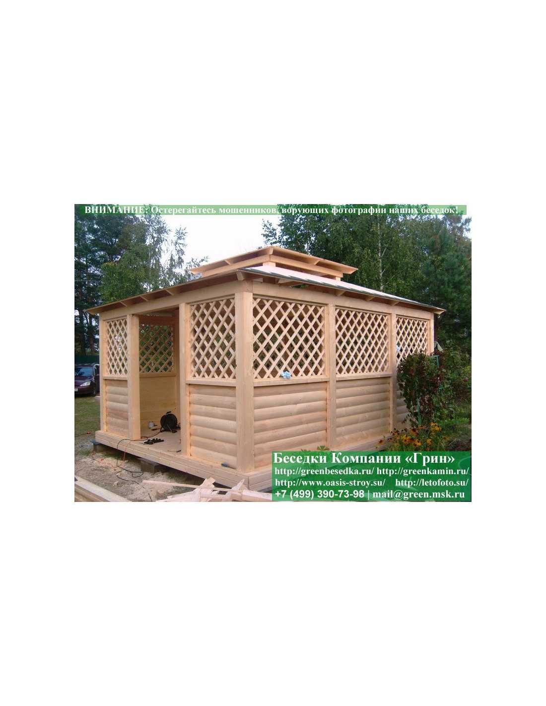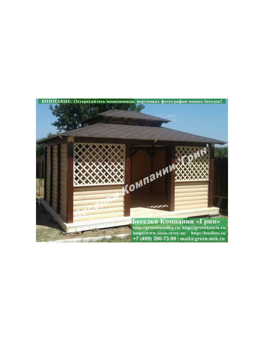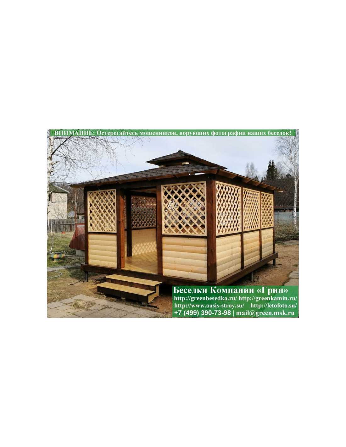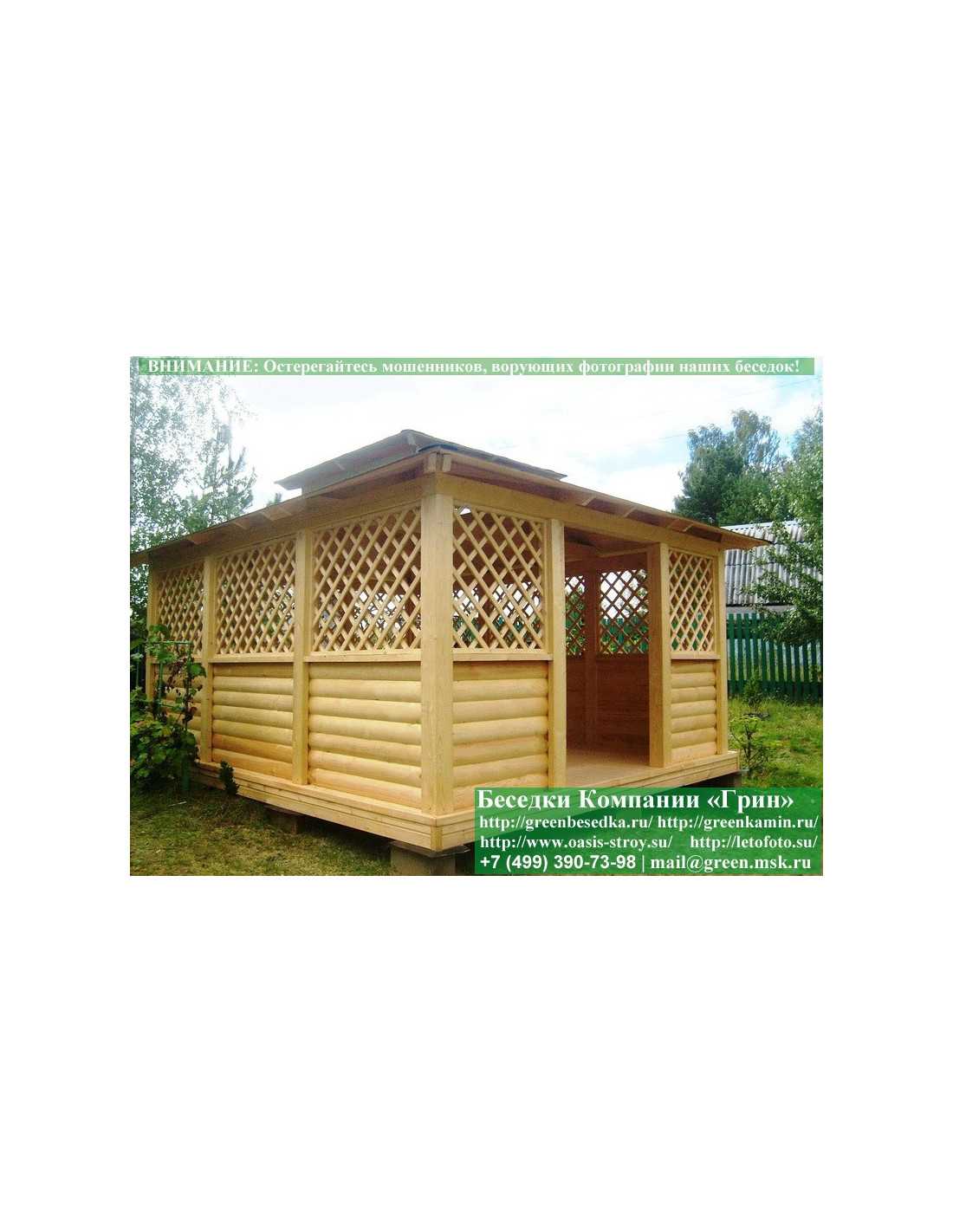 Японская беседка для дачи 4х5 метров изготавливаются из сосны, с двухъярусной крышей с воздушным клапаном. Воздушный клапан не выполняет ни каких функций и имеет декоративное назначение. Низ беседки, до подоконника, беседка изготавливается из блокхауса (имитация бревна), выше подоконника, с 4-х сторон, беседка закрыта перголами (решетками). Можно сделать глухие стенки. В качестве несущих стоек используется строганый брус 100х100 (90х90) или 150х150 (140х140) мм, естественной влажности. На крышу беседки укладывается мягкая битумная черепица: Коричневых, Зеленых и Бордовых цветов. Срок изготовления и монтажа беседки на участке 7-14 дней. Беседки поставляются в не крашеном виде.