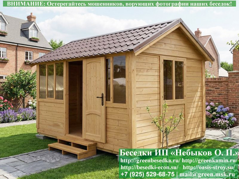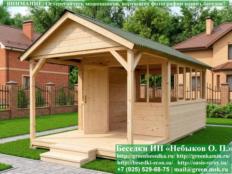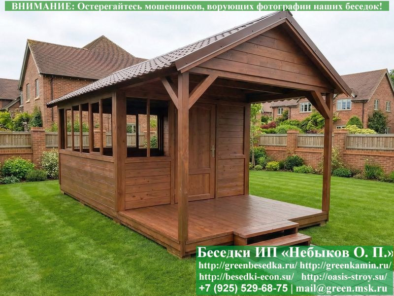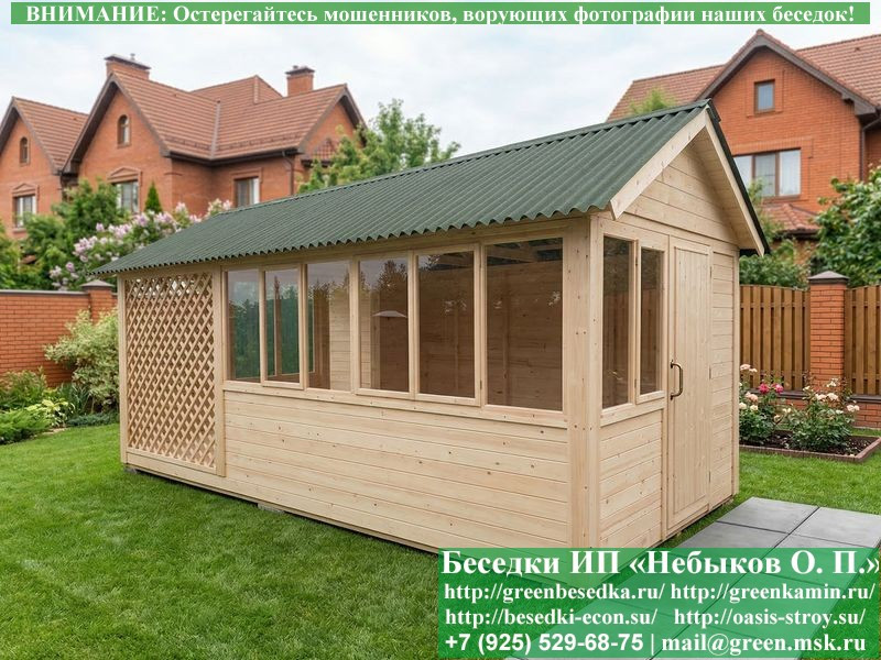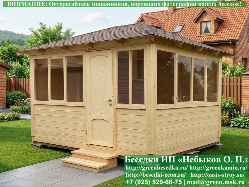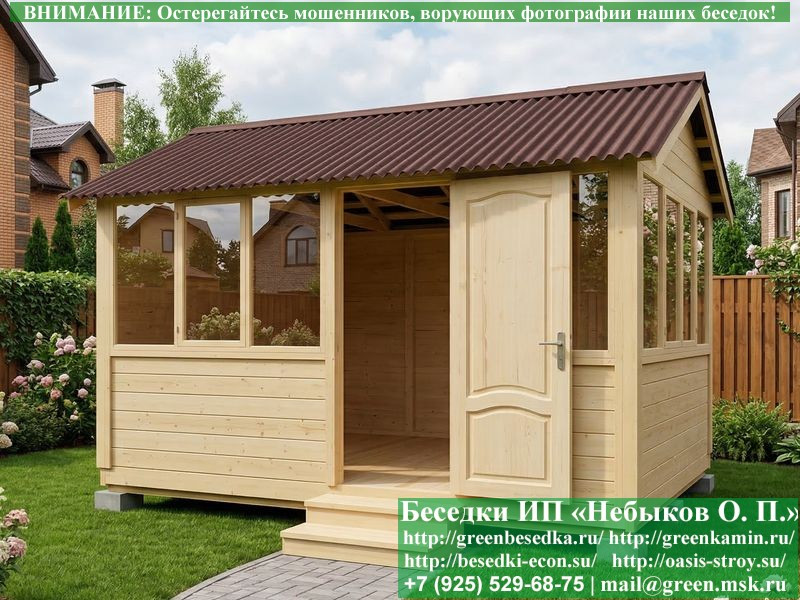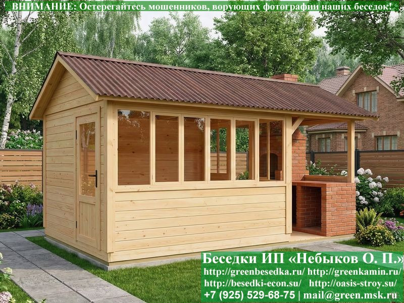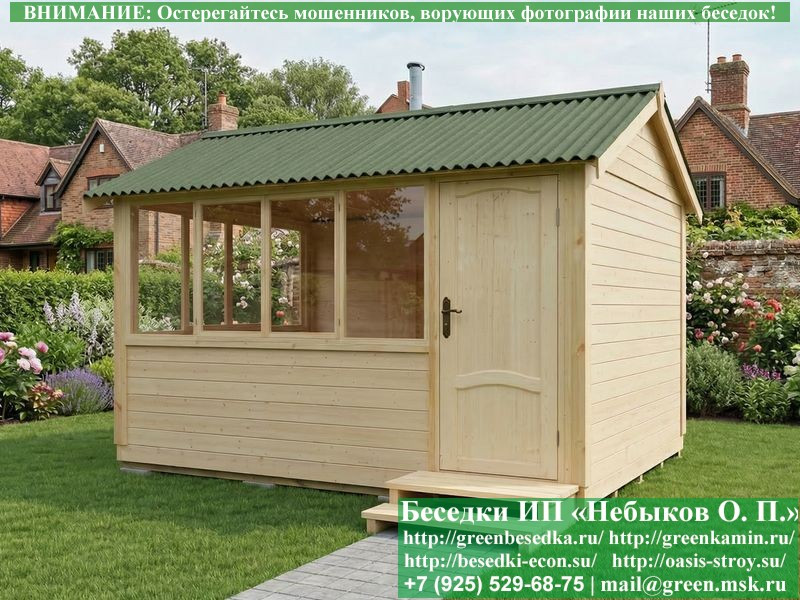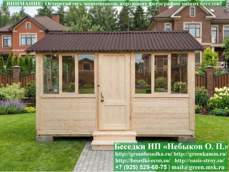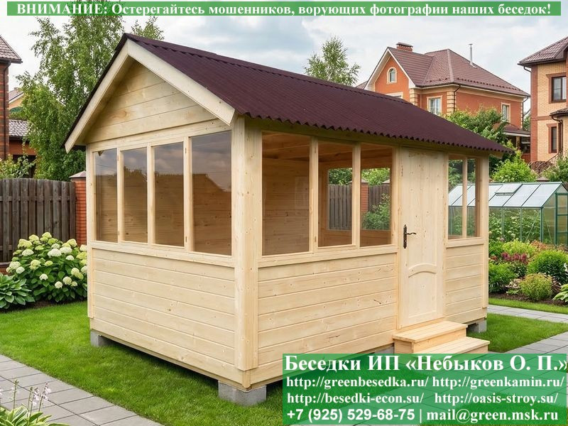 В цену входит беседка с глухой стенкой. Закрытая застекленная беседка 3х4 метра изготавливается из сосны. При строительстве беседок используется сухой материал камерной сушки. В качестве каркаса беседки используется очень надежная имитация бруса 17х140 мм. В отличие от вагонки ее не выгибает, она не набухает и не идет трещинами. Усиленная конструкция крепления стенок. В качестве несущих стоек используется строганый брус. По углам 90х90 мм. На пол кладется толстая сухая строганая доска 35 мм. В беседку устанавливаются однорамные террасные деревянные окна. Толщина стекла 3 мм. Окна можно заменить на деревянные двойные однокамерные (финки). Устанавливается сплошная деревянная филенчатая дверь. Окна и двери поставляются без фурнитуры. Их можно установить дополнительно, по договоренности. Дверь можно заменить на металлическую или пластиковую. На крышу беседки укладывается ондулин: Коричневых, Зеленых, Бордовых, Серых цветов. Срок изготовления и монтажа беседки на участке составляет 5-10 дней. Беседки поставляются в не крашеном виде. Возможна покраска беседок краской, лаком или обработка антисептиком. Дополнительно предлагаем установку в деревянные беседки недорогих безопасных быстровозводимых печей-барбекю, установка в течение дня, или более дорогих и сложных комплексов-барбекю и мангалов-барбекю из кирпича.