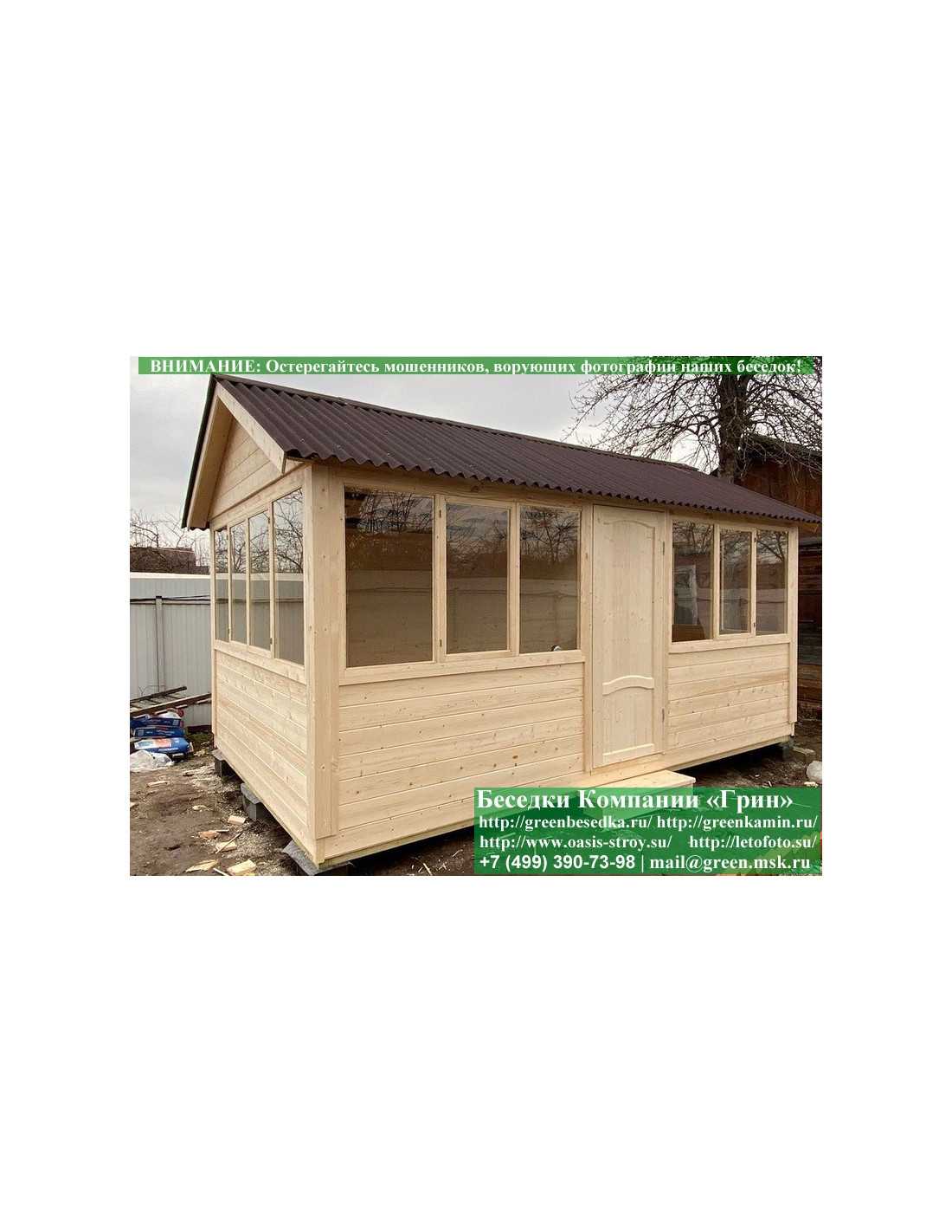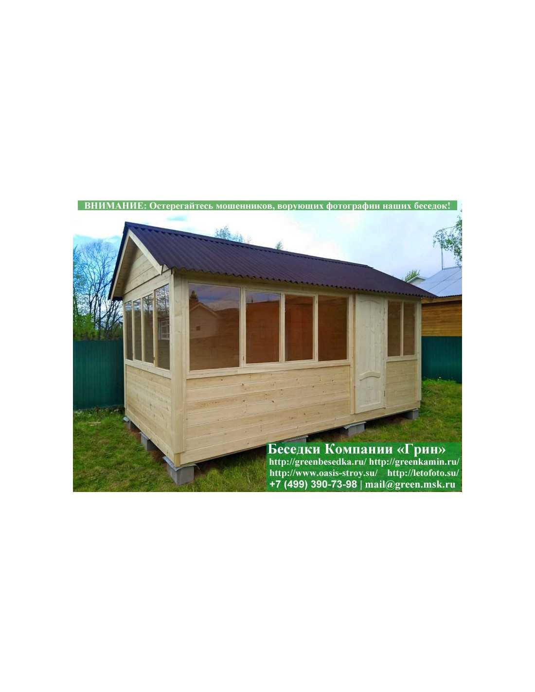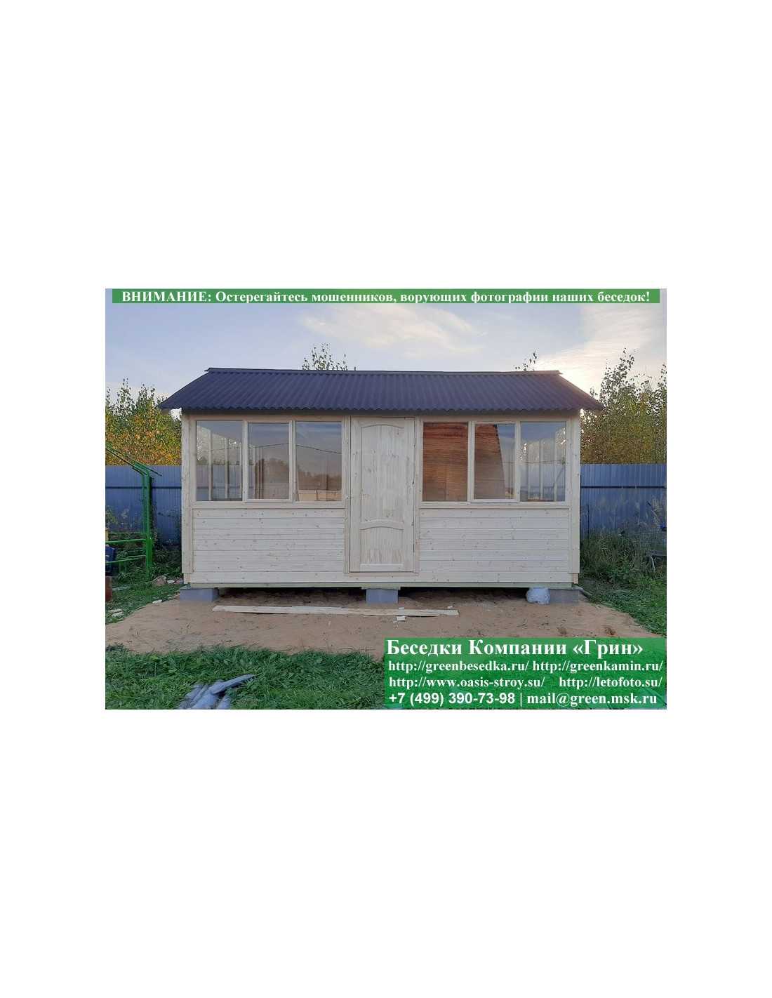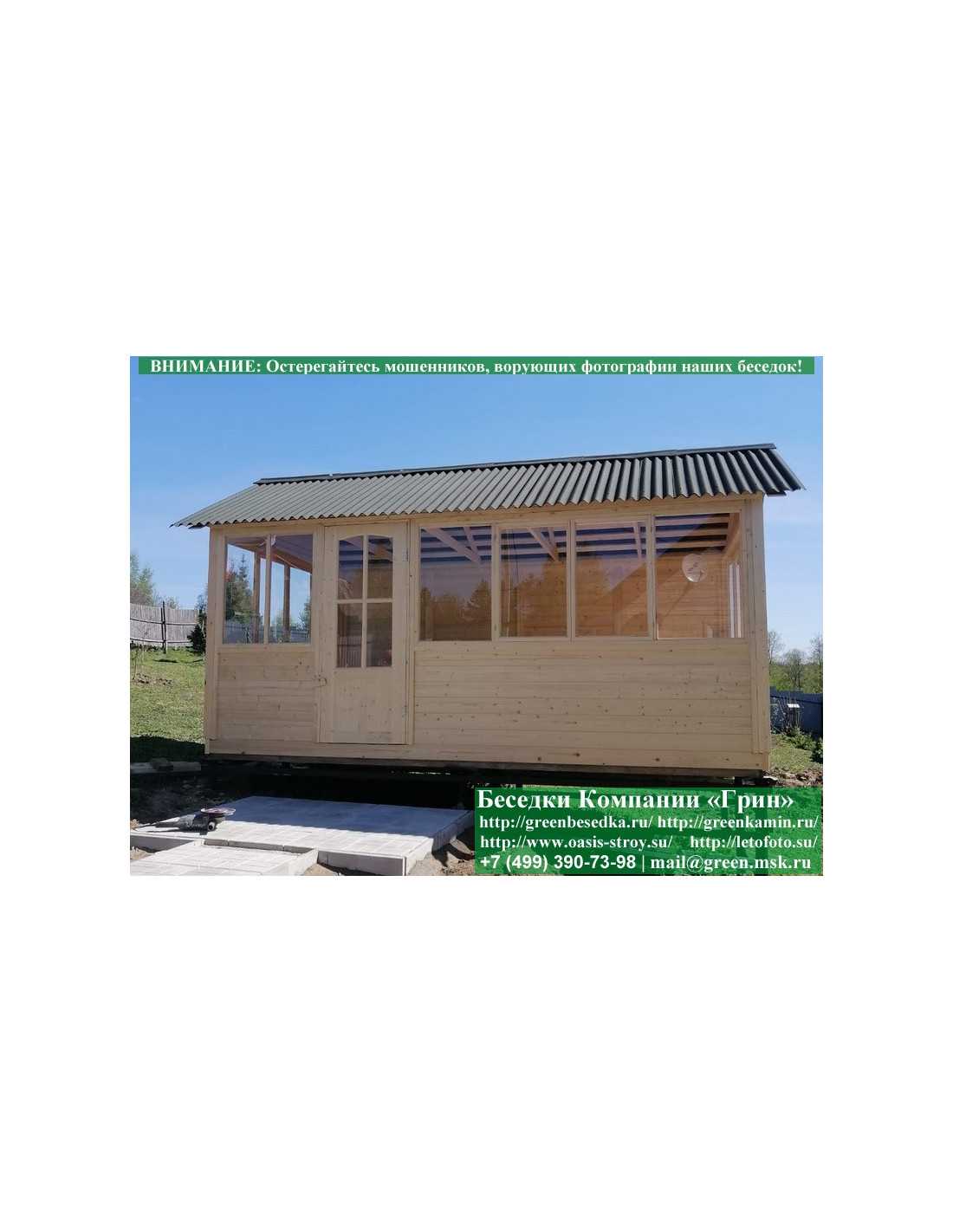В цену входит беседка с глухой стенкой. Закрытая застекленная беседка 3х5 метров изготавливается из сосны. При строительстве беседок используется сухой материал камерной сушки. В качестве каркаса беседки используется очень надежная имитация бруса 17х140 мм. В отличие от вагонки ее не выгибает, она не набухает и не идет трещинами. Усиленная конструкция крепления стенок. В качестве несущих стоек используется строганый брус. По углам 90х90 мм. На пол кладется толстая сухая строганая доска 35 мм. В беседку устанавливаются однорамные террасные деревянные окна. Толщина стекла 3 мм. Окна можно заменить на деревянные двойные однокамерные (финки). Устанавливается сплошная деревянная филенчатая дверь. Окна и двери поставляются без фурнитуры. Их можно установить дополнительно, по договоренности. Дверь можно заменить на металлическую или пластиковую. На крышу беседки укладывается ондулин: Коричневых, Зеленых, Бордовых, Серых цветов. Срок изготовления и монтажа беседки на участке составляет 5-10 дней. Беседки поставляются в не крашеном виде. Возможна покраска беседок краской, лаком или обработка антисептиком. Дополнительно предлагаем установку в деревянные беседки недорогих безопасных быстровозводимых печей-барбекю, установка в течение дня, или более дорогих и сложных комплексов-барбекю и мангалов-барбекю из кирпича.