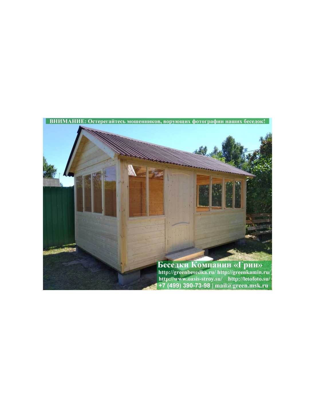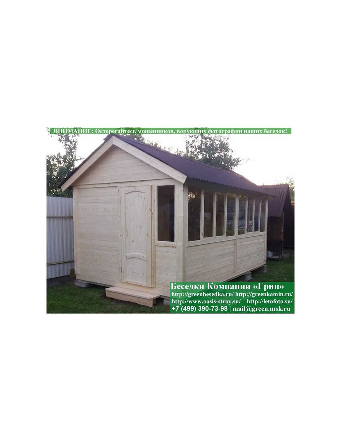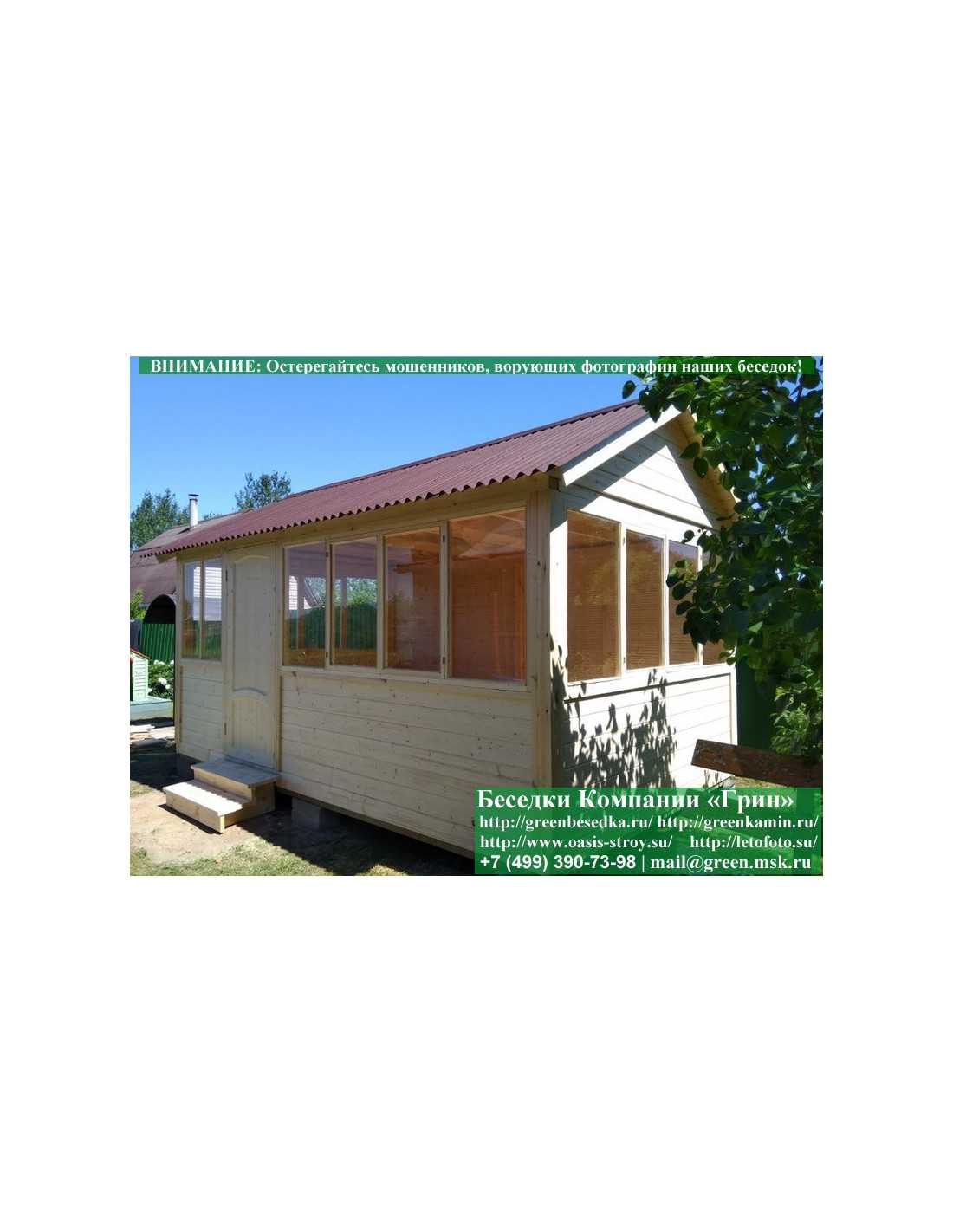 В цену входит беседка с глухой стенкой. Закрытая застекленная беседка 3х5 метров изготавливается из сосны. При строительстве беседок используется сухой материал камерной сушки. В качестве каркаса беседки используется очень надежная имитация бруса 17х140 мм. В отличие от вагонки ее не выгибает, она не набухает и не идет трещинами. Усиленная конструкция крепления стенок. В качестве несущих стоек используется строганый брус. По углам 90х90 мм. На пол кладется толстая сухая строганая доска 35 мм. В беседку устанавливаются однорамные террасные деревянные окна. Толщина стекла 3 мм. Окна можно заменить на деревянные двойные однокамерные (финки). Устанавливается сплошная деревянная филенчатая дверь. Окна и двери поставляются без фурнитуры. Их можно установить дополнительно, по договоренности. Дверь можно заменить на металлическую или пластиковую. На крышу беседки укладывается ондулин: Коричневых, Зеленых, Бордовых, Серых цветов. Срок изготовления и монтажа беседки на участке составляет 5-10 дней. Беседки поставляются в не крашеном виде. Возможна покраска беседок краской, лаком или обработка антисептиком. Дополнительно предлагаем установку в деревянные беседки недорогих безопасных быстровозводимых печей-барбекю, установка в течение дня, или более дорогих и сложных комплексов-барбекю и мангалов-барбекю из кирпича.