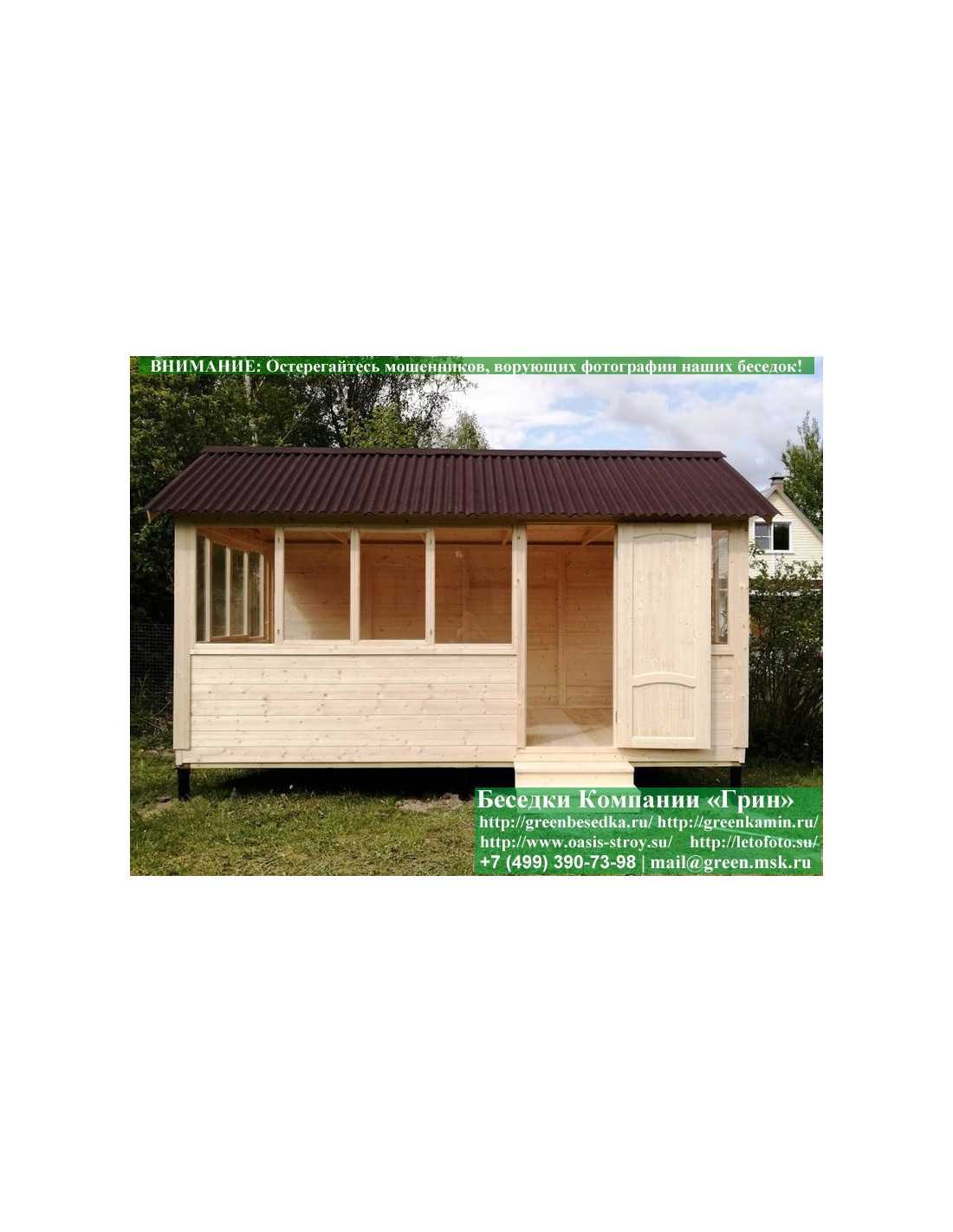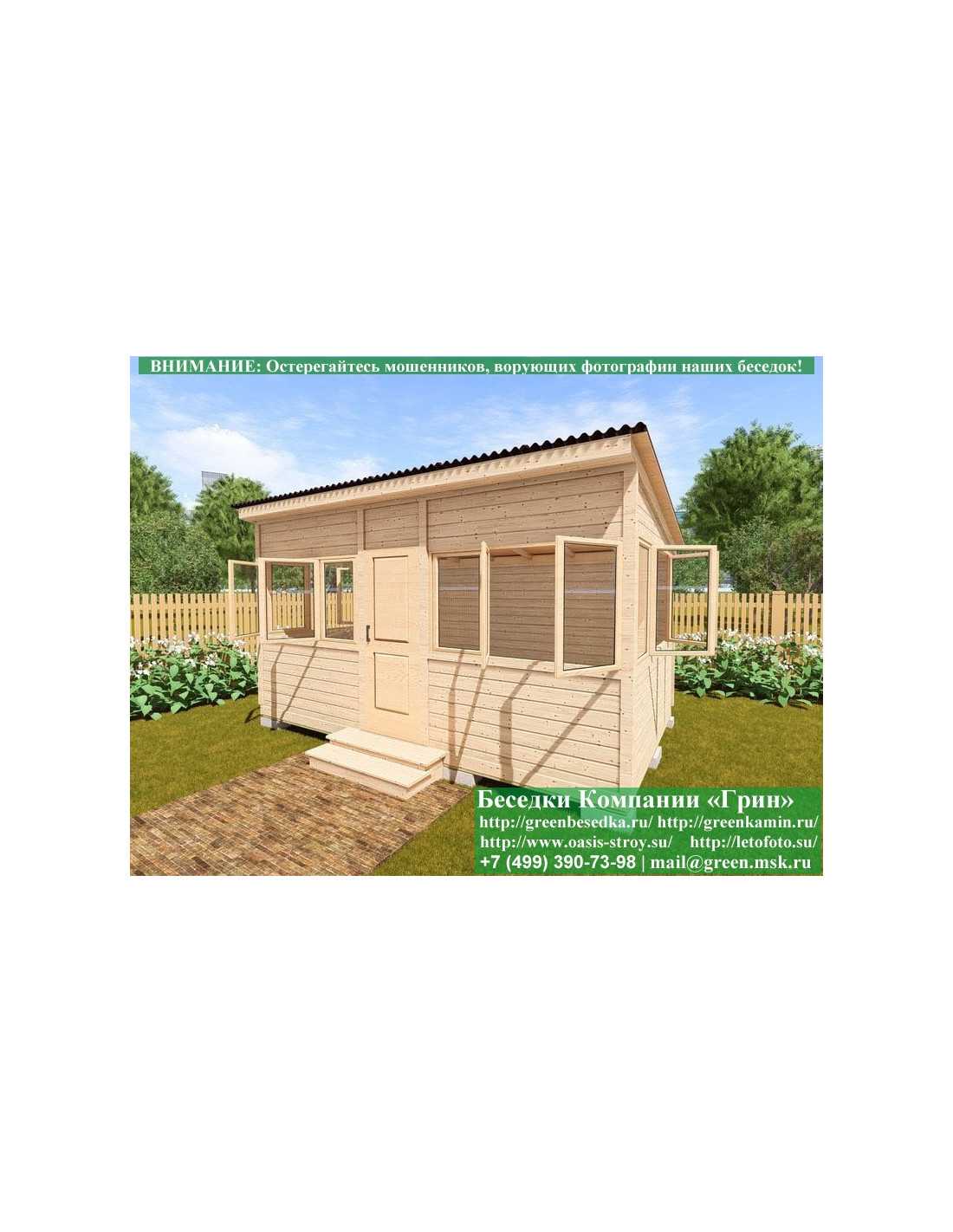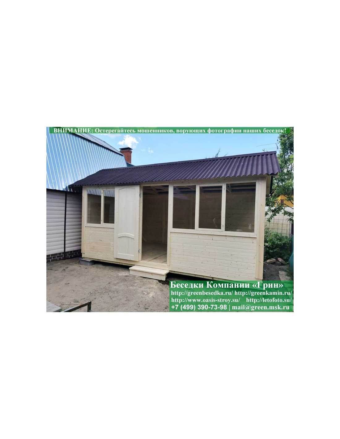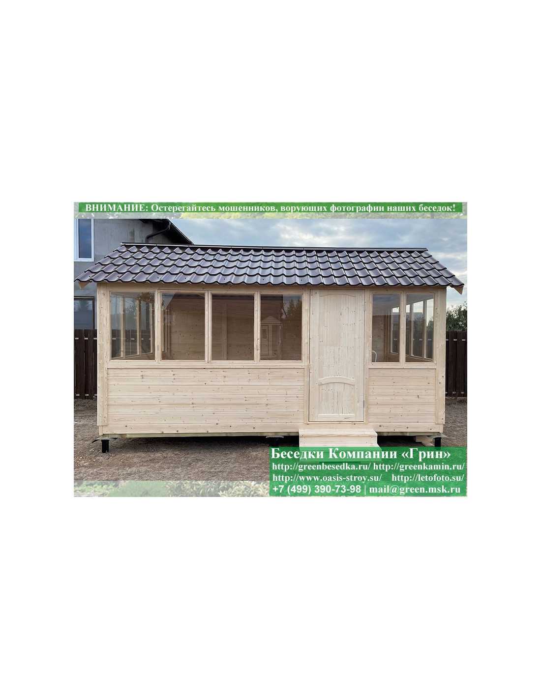 В цену входит беседка с глухой стенкой. Закрытая застекленная беседка 3х5 метров изготавливается из сосны. При строительстве беседок используется сухой материал камерной сушки. В качестве каркаса беседки используется очень надежная имитация бруса 17х140 мм. В отличие от вагонки ее не выгибает, она не набухает и не идет трещинами. Усиленная конструкция крепления стенок. В качестве несущих стоек используется строганый брус. По углам 90х90 мм. На пол кладется толстая сухая строганая доска 35 мм. В беседку устанавливаются однорамные террасные деревянные окна. Толщина стекла 3 мм. Окна можно заменить на деревянные двойные однокамерные (финки). Устанавливается сплошная деревянная филенчатая дверь. Окна и двери поставляются без фурнитуры. Их можно установить дополнительно, по договоренности. Дверь можно заменить на металлическую или пластиковую. На крышу беседки укладывается ондулин: Коричневых, Зеленых, Бордовых, Серых цветов. Срок изготовления и монтажа беседки на участке составляет 5-10 дней. Беседки поставляются в не крашеном виде. Возможна покраска беседок краской, лаком или обработка антисептиком. Дополнительно предлагаем установку в деревянные беседки недорогих безопасных быстровозводимых печей-барбекю, установка в течение дня, или более дорогих и сложных комплексов-барбекю и мангалов-барбекю из кирпича.