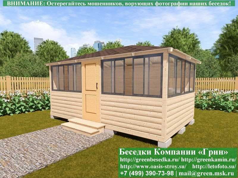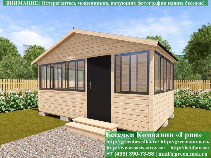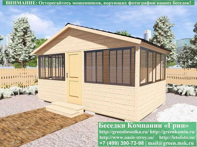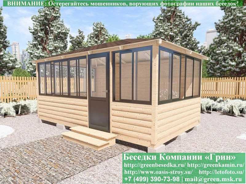 Застекленная беседка 3х5 метров изготавливается из сосны, по специальной каркасной технологии. При строительстве беседок используется сухой материал камерной сушки. В качестве каркаса беседки используется  очень надежная имитация бруса 17х140 мм. В отличие от вагонки, она не гнется, не набухает и не идет трещинами. Используется усиленная конструкция крепления стенок. В качестве несущих стоек используется строганый брус, по углам 90х90 мм. На пол кладется толстая сухая строганая доска 35 мм. В беседку устанавливаются однорамные раздвижные алюминиевые окна. Количество застекленных сторон и количество открывающихся окон обговаривается. Стандартно устанавливается недорогая сплошная деревянная филенчатая дверь. Дверь закупается в Лемана-Про. Гарантии не подлежит. Деревянную дверь можно заменить на более надежную металлическую или пластиковую дверь. Срок изготовления и установки беседки на участке составляет 10-14 дней (изготовление алюминиевых окон). Беседки поставляются в не крашеном виде. Возможна покраска беседок или обработка антисептиком\.