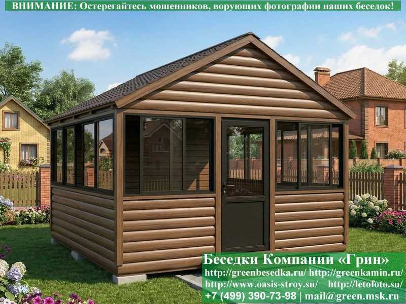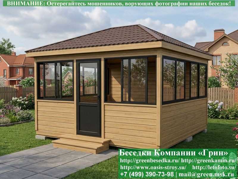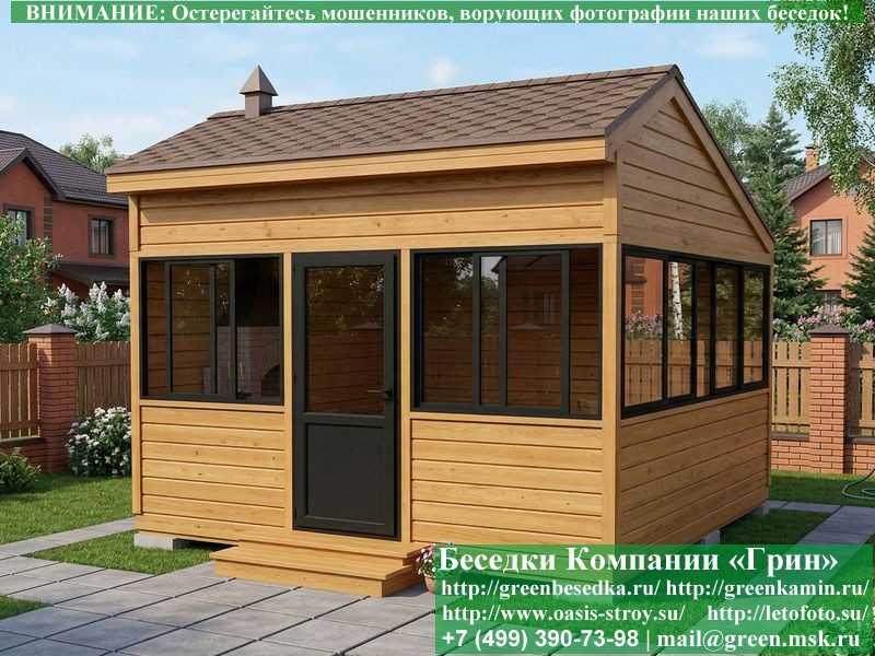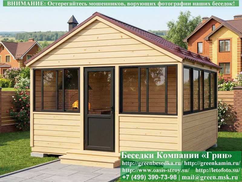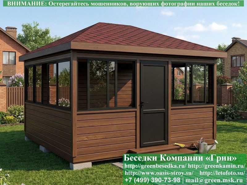 Застекленная беседка 4х4 метра изготавливается из сосны, по специальной каркасной технологии. При строительстве беседок используется сухое дерево камерной сушки. В качестве каркаса беседки используется  очень надежная Имитация бруса 17х140 мм. В отличие от вагонки, она не гнется, не набухает и не идет трещинами. Имитацию бруса можно заменить на блокхаус (имитация бревна). Используется усиленная конструкция крепления стенок. В качестве несущих стоек используется строганый брус. По углам дополнительно устанавливается брус 90х90 мм. На пол кладется толстая сухая строганая доска 35 мм (не шпунт). Пол обрабатывается антисептиком. Половую доску можно заменить на шпунтованную 36 мм или террасную доску ДПК. В беседку устанавливаются однорамные раздвижные алюминиевые окна фирмы "Русокон". Количество застекленных сторон и количество открывающихся окон обговаривается дополнительно. Устанавливается железная или алюминиевая дверь. Беседки изготавливаются с односкатной, двухскатной, четырехскатной крышей. На крышу кладется металлочерепица, мягкая черепица или профлист: Коричневых, Зеленых, Бордовых, Серых цветов. Срок изготовления и установки беседки на участке составляет 10-14 дней (срок изготовление алюминиевых окон). Беседки поставляются в не крашеном виде. Возможна покраска беседок в цеху или полная обработка антисептиком. Дополнительно предлагаем установку в деревянные беседки с алюминиевыми окнами недорогих безопасных быстровозводимых печей-барбекю, установка в течение дня, или более дорогих и сложных комплексов-барбекю и мангалов-барбекю из кирпича.